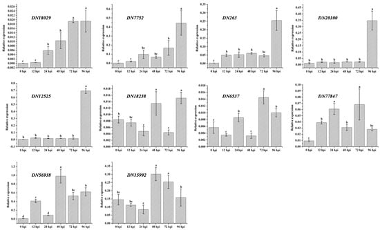 Finally, to investigate the expression profiles of the candidate effector genes at six different time points following infection during F. proliferatum–tomato interaction, ten of the 17 candidate effector genes confirmed above by qRT–PCR were subjected again to qRT–PCR using infected leaves from 0, 12, 24, 48, 72 and 96 hpi. The expression of DN18029 increased steadily from 0 to 96 hpi, but high expression levels of DN263, DN20100 and DN12525 were observed only at 96 hpi (Figure 7). However, DN7752 and DN18238 were expressed at relatively high levels at 96 hpi, whereas DN56938 and DN15992 were expressed at high levels at 48 hpi, and DN6537 and DN77847 at 72hpi.