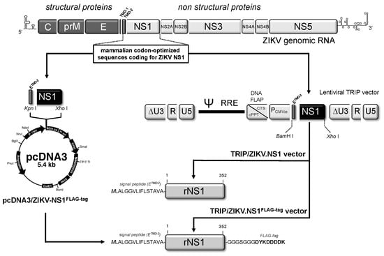 Cloning strategy of pcDNA3/ZIKV.NS1 and TRIP/ZIKV.NS1. In top, the schematic representation of Zika virus (ZIKV) genomic RNA with the E gene including the two transmembrane domains TMD-1 and TMD-2 at its C-terminus followed by the NS1 gene. In right, the mammalian codon-optimized sequence encoding TMD-2 from E followed by NS1 was cloned into the plasmid vector pcDNA3(+) under the control of human cytomegalovirus promoter (PCMV). The resulting plasmid pcDNA3/ZIKV.NS1 includes the signal peptide of NS1 (ETMD-2) and the entire NS1 gene of epidemic ZIKV strain BeH81905, followed by a glycine–serine spacer and a FLAG-tag at the C-terminus of NS1. In left, the mammalian codon-optimized sequences encoding TMD-2 from E followed by NS1 were cloned into the lentiviral TRIP vector under the control of immediate early CMV promoter (PCMVie). Recombinant TRIP/ZIKV.NS1 vector and TRIP/ZIKV.NS1FLAG-tag vector include the same ZIKV sequence that pcDNA3/ZIKV.NS1 except TRIP/ZIKV.NS1 vector that has been deleted of the spacer and FLAG-tag at the C-terminus of NS1. In bottom, the design of recombinant ZIKV NS1 (rNS1) protein with its signal peptide ETMD-2 and followed or not by a spacer and a FLAG-tag is represented. The recombinant NS1 sequences are described in Figure S2.