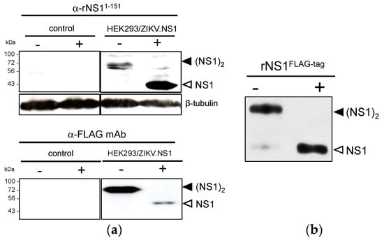Expression of recombinant ZIKV NS1 protein in HEK-293 cells stably transfected with a plasmid vector. (a) Immunoblot analysis of rNS1 expression in RIPA lysates from HEK293/ZIKV.NS1FLAG-tag (HEK293/ZIKV.NS1) and mock-transfected HEK293 (control) cells. Samples were heat-denatured (+) or not (−) before immunoblotting with rat anti-NS1 serum (α-rNS11–151) or mouse anti-FLAG mAb (α-FLAG mAb). Detection of β-tubulin served as protein loading control; (b) Samples of purified rNS1FLAG-tag were heat-denatured (+) or not (−) and then analyzed by immunoblotting with anti-FLAG mAb. The bands corresponding to NS1 dimer (black arrow head) and NS1 monomer (open arrow head) are indicated to the right of the blot.