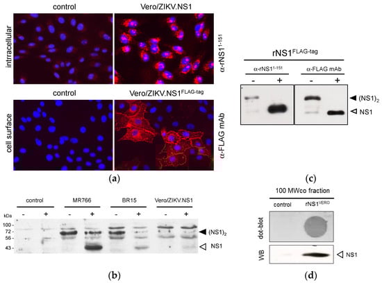 Lentiviral vectors represent an attractive platform allowing NS1 protein production in mammalian cells [32,33,34]. The mammalian codon-optimized ZIKV NS1 gene was inserted in lentiviral vector TRIP, to generate recombinant lentiviral vectors expressing NS1 with or without FLAG-tag (Figure 1). The attempts to establish stably transduced HEK293 cell lines expressing recombinant NS1 of ZIKV were unsuccessful. Consequently, we decided to transduce Vero cells to generate stable Vero/ZIKV.NS1 and Vero/ZIKV.NS1FLAG-tag cell lines. By immunofluorescence analysis, both Vero/ZIKV.NS1 and Vero/ZIKV.NS1FLAG-tag cells were positively stained with anti-rNS11–151 immune serum and anti-FLAG mAb, respectively (Figure 3a). ZIKV rNS1 is expressed on the plasma membrane of transduced Vero cells consistent with a cell membrane interaction of NS1 dimer, as has been reported with authentic NS1 [18]. Immunoblot assays were performed on RIPA cell lysates of Vero/ZIKV.NS1 cells (Figure 3b). As positive controls, Vero cells were infected with ZIKV molecular clones derived from African strain MR766 isolated in Uganda in 1947, and Asian strain BeH819015 isolated in Brazil in 2015 (hereafter designed BR15). Anti-rNS11–151 immune serum confirmed the expression of rNS1 in Vero/ZIKV.NS1 cells (Figure 3b).