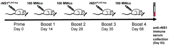 Adult Wistar rats were serially subcutaneously inoculated with rNS1 in PBS mixed with Complete Freund’s Adjuvant (prime immunization) or Incomplete Freund’s Adjuvant (the antigenic boosts) in a final volume of 0.2 mL. Three months after the prime, whole blood was collected by cardiac puncture after rats were anesthetized.