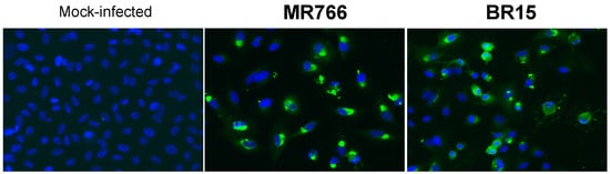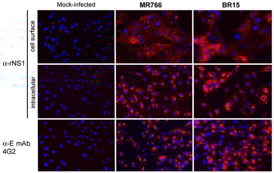 We assessed whether the rat immune serum reacted with NS1 produced in host cells infected with ZIKV. Immunofluorescence assays were performed on Vero cells infected for 48 h with MR766 and BR15 (Figure 5). Anti-pan flavivirus E mAb 4G2 was used as a positive control for ZIKV infection [35]. We showed that rat immune serum collected at Day 83 strongly reacted with intracellular and plasma membrane-associated NS1, regardless the viral strains tested. Thus, hyperimmunization of rat with rNS1 elicited the production of anti-NS1 immune serum that reacts with African and Asian strains of ZIKV.