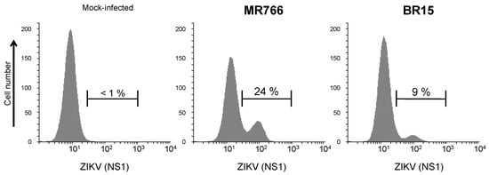 Reactivity of rat anti-rNS1 immune serum against NS1 produced in human epithelial cells infected by ZIKV. A549 cells were infected for 24 h with ZIKV strains MR766 and BR15 or mock-infected (no virus). Fixed cells were permeabilized and incubated with rat anti-rNS1 immune serum at dilution 1:1000 as primary antibody. The percentages of ZIKV-infected A549 cells positively stained with anti-rNS1 immune serum were determined by flow cytometry analysis, and the values are indicated on the top.