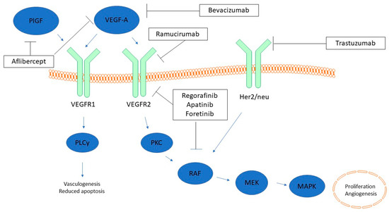 VEGF receptor signaling and targets of anti-angiogenic therapy (modified). PlGF and VEGF-A act through VEGFR1 while VEGFR2 is only stimulated by VEGF-A. Inhibitors of the pathways are shown in boxes. Downstream pathways are simplified for better orientation. PlGF = Placental growth factor; VEGF = Vascular endothelial growth factor; VEGFR = Vascular endothelial growth factor receptor; Her2/neu = human epidermal growth factor receptor 2; PLCy = Phospolipase C y; PKC = protein kinase C; RAF = Rapidly accelerated sarcoma kinase; MEK (MAPKK) = Mitogen-acitvated protein kinase kinase; MAPK = mitogen-activated protein kinase. Blue arrow = activation; black T-bar arrow = inhibition.