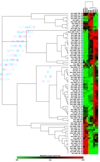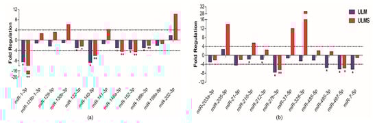 In order to provide a more detailed investigation, the threshold line was increased from X to Y of −4 and +4. Elevation of the cut-off value distinguished 13 miRNAs with significant different expression in ULM compared to MM. Of these, eight were overexpressed (miR-132-3p, miR-199b-3p, miR-199a-5p, miR-202-3p, miR-205-5p, miR-212-3p, miR-328-3p, and miR-497-5p) and five were underexpressed (miR-1-3p, miR-130b-3p, miR-210-3p, miR-31-5p, and miR-7-5p). Thirteen altered miRNAs were found to be differentially expressed in ULMS compared to MM, where five were overexpressed (miR-129-5p, miR-141-3p, miR-148a-3p, miR-202-3p, and miR-203a-3p) and eight were underexpressed (miR-1-3p, miR-125b-1-3p, miR-140-5p, miR-152-3p, miR-21-5p, miR-27b-3p, miR-485-5p, and miR-495-3p). Comparative analysis between ULM and ULMS displayed six up-regulated miRNAs (miR-130b-3p, miR-148-3p, miR-203a-3p, miR-204-5p, miR-31-5p, and miR-7-5p) and 20 down-regulated (miRNAs let-7a-5p, let-7b-5p, let-7e-5p, miR-10b-5p, miR-125b-1-3p, miR-140-5p, miR-145-5p, miR-152-3p, miR-181a-5p, miR-181b-5p, miR-181c-5p, miR-199b-3p, miR-199a-5p, miR-205-5p, miR-21-5p, miR-22-3p, miR-27a-3p, miR-27b-3p, miR-29a-3p, miR-485-5p, and miR-495-3p) in ULMS cells (Figure 2).