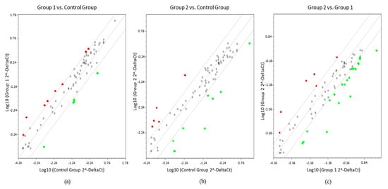 Scatter plots showing comparisons between groups. (a) ULM (group 1) compared with MM (control group); (b) ULMS (group 2) compared with control group; (c) Group 1 compared with group 2 (FC expression cut-off values of +4 and −4). In red, overexpressed miRNAs and, in green, underexpressed miRNAs.