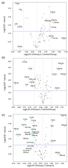 Volcano plots with differentiated expression of miRNAs. (a) miRNAs expression in ULM (group 1) compared with MM (control group); (b) miRNA expression in ULMS (group 2) compared with MM; (c) miRNAs expression in ULMS compared with ULM. FC expression cut-off values of +4 and −4. In green, down-regulated miRNAs and, in red, up-regulated miRNAs.
