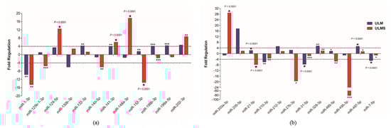 Subsequent analysis of fold change by volcano plot identified 24 miRNAs that were highly deregulated in ULM and ULMS. The expression pattern of ULM evidenced that the miRNAs miR-31-5p and miR-7-5p were significantly underexpressed (p < 0.0001) while the miR-497-5p was overexpressed (p < 0.0001). In ULMS, 3 miRNAs—miR-21-5p, miR-27b-3p, and miR-152-3p—had a highly significant underexpression (p < 0.0001), and 4 miRNAs—miR-129-5p, miR-141-3p, miR-148a-3p, and miR-203a-3p—presented a significant overexpression (p < 0.0001) (as seen in Figure 3 and Figure 4). Differences in miRNA expression between ULM and ULMS were also assessed. Referring to the ULM cell line, 6 miRNAs were up-regulated and 20 were down-regulated in ULMS (as seen in Figure 3c).