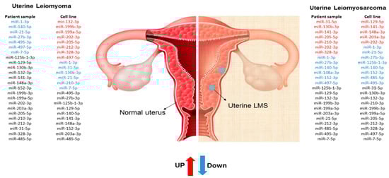 Tumor suppressor or oncogenic miRNAs are being considered targets for new therapeutic strategies. These new therapies are seeking to recover tumor suppressor proteins and inhibit oncogenic ones by restoring the miRNAs that are underexpressed and silencing the miRNAs that are up-regulated [25]. miRNA abnormality is well-tolerated in normal tissues, but it can profoundly influence the behavior of cells and tissues. Thus, miRNA inhibition or delivery may provide a highly potent means to modulate a disease process while avoiding unwanted toxic effects in normal tissues [26]. The expression profile of miRNAs may be relevant as a diagnostic biomarker for differentiating ULM cells from ULMS cells. These tumors have similar radiographic appearances, and ULMS cells are not diagnosed until the time of surgery. Due to the risk of accidental dissemination of the ULMS tissue during removal of a presumed benign uterine fibroid, the identification of a biomarker would facilitate referral to a proper initial surgical procedure [27].