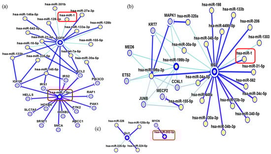 Interaction network of miR-7-5p and miR-1. (a) The miR-7-5p strongly modulates the EGFR, IGF1R, RAF1, and BCL2 genes while the miR-1 showed a weak interaction; (b) The miR-1 has a strong interaction with MET; (c) miR-202 showing a strong interaction with MYCN. In dark blue: strong evidence (reporter assay, Western blot, qRT-PCR, or qPCR) and, light blue, other evidence.
