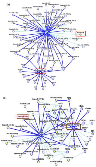 Interaction network of miRNAs. (a) miR-1 showed a weak modulation of BCL2; (b) miR-140-5p strongly interact with VEGFA. Dark blue shows strong evidence (reporter assay, Western blot, qRT-PCR or qPCR), and light blue shows other evidence.