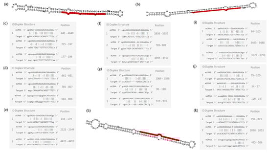 Molecular structures of miR-7-5p, miR-140-5p, and 202-3p. (a) Pre-miRNA hairpin of miR-7-5p, second structure of pre-miRNA, and, in red, mature sequence: 24| UGGAAGACUAGUGAUUUUGUUGU |46; (b) Pre-miRNA hairpin of miR-140-5p, 2nd structure of pre-miRNA, and, in red, mature sequence: 23| CAGUGGUUUUACCCUAUGGUAG |44; (c) miR-7-5p sequence of target interactions—EGFR; (d) miR-7-5p sequence of target interactions—RAF1; (e) miR-7-5p sequence of target interactions—BCL2 and position in the gene sequence; (f) miR-7-5p sequence of target interactions—IGF1R; (g) miR-140-5p sequence of target interactions—VEGFA; (h) Pre-miRNA hairpin of miR-202-3p, 2nd structure of pre-miRNA, and, in red, mature sequence: 64| AGAGGUAUAGGGCAUGGGAA |83; (i) miR-202-3p sequence of target interactions—IGF1R; (j) miR-202-3p sequence of target interactions–GLI1; (k) miR-1-3p sequence of target interactions—MET. Mature sequence of miR-1-3p: 53| UGGAAUGUAAAGAAGUAUGUAU |74. Pre-miRNA hairpin structure of miR-1-3p is unknown.