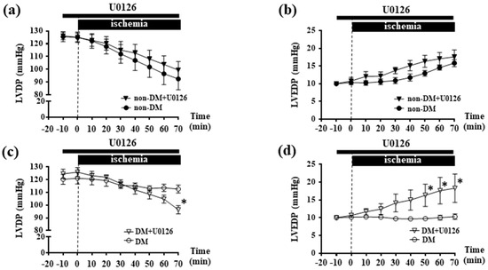 We finally evaluated the contribution of mitochondrial ERK1/2 to ischemic resistance in DM hearts using U0126. When isolated hearts were perfused with U0126, where cytosolic and mitochondrial ERK1/2 were significantly suppressed both in non-DM and DM hearts (Figure 4e,f), U0126 abolished ischemic resistance of DM hearts; i.e., U0126 decreased LVDP (DM hearts with U0126; 96.4 ± 3.2 mmHg, p < 0.05 vs. 112.7 ± 3.1 mmHg of DM hearts, Figure 4c) and increased LVEDP during ischemia in DM hearts (DM hearts with U0126; 18.3 ± 4 mmHg p < 0.05 vs. 10.3 ± 0.7 mmHg of DM, Figure 4d), whereas did not alter in non-DM hearts (Figure 4a,b). These results suggest that ischemic resistance of DM hearts may be mediated through cytosolic and/or mitochondrial ERK1/2 activation.