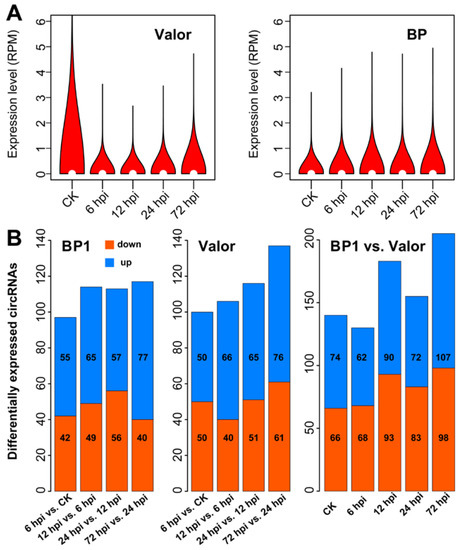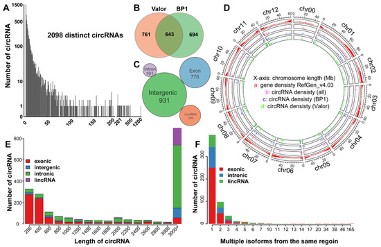 Until now, circRNAs have been identified in multiple monocot and dicot plants [13]. However, our current understanding of the characteristic and biological roles of circRNAs in the potato-pathogen interaction remains limited. In this study, 13.8 billion 90 bp paired-end raw reads from two potato cultivars were used for circRNAs identification. Low quality reads were filtered and clean reads were mapped to reference genome by Burrows-Wheeler Aligner (BWA) (v0.7.15, mem -T 19), resulting in about 10.6 billion reads being uniquely mapped. The Sequence Alignment/Map (SAM) files of alignment were then scanned by circRNA identification tool CIRI2, which led to the identification of 76,882 junction reads. And 2098 circRNAs were finally detected in these thirty samples supported by at least two unique back-spliced reads, with 1404 in cultivar Valor and 1337 in cultivar BP1 (Tables S1 and S2). Among these identified circRNAs, 761 were specifically expressed in Valor, and 694 in BP1, respectively, suggesting that circRNAs are cultivar specific (Figure 1A,B).