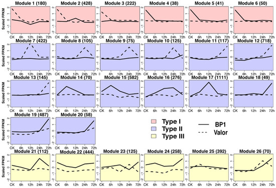 Genes clustered in type I modules were characterized as suddenly down-regulated in either cultivar. In modules 1, 2, and 3, genes were down-regulated in Valor, but not in BP1 (Figure 4). Three modules enriched genes for photosynthesis and response to biotic stimulus (Table S11). For example, lots of receptor-like protein kinases (RLKs), which play important roles in activating plant innate immunity [31], were enriched in module 2. In module 2, RLKs were suddenly down-regulated in susceptible cultivar Valor, but slightly up-regulated in disease tolerant cultivar BP1 after 6 hpi, suggesting that rapid immune response in Valor were suppressed, whereas BP1 has a more rapidly response to the infection. In modules 4–6, genes that are functionally related to negative regulation of metabolism, were down-regulated in BP1, but not in Valor, which is consistent with disease tolerant phenotype of cultivar BP1 (Figure 4).