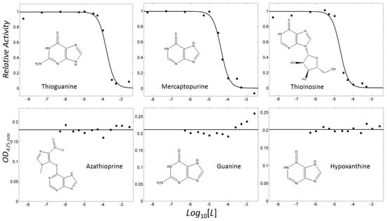 Profiles showing concentration-dependent inhibition. Activities were scaled to a relative value in the range of 0–1 for thioguanine, mercaptopurine, and thioinosine. Optical densities at 475 nm (OD475nm) were shown for azathioprine, guanine, and hypoxanthine.