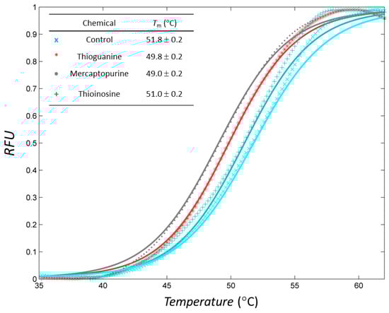Profiles of differential scanning fluorimetry (DSF) analyses of inhibitors. Markers and lines indicate the raw and fitted data, respectively, in each case. Normalised profiles with relative fluorescence unit (RFU) were constructed in the range of 35–65 °C.