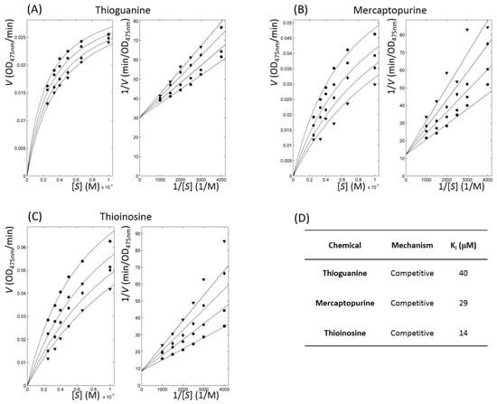 The kinetics of enzymes with inhibitory action classified thioguanine, mercaptopurine, and thioinosine as competitive inhibitors. We directly fitted all of the substrate and inhibitor concentration-dependent velocities using the modified Michaelis–Menten equation in a nonlinear manner through the minimisation of χ2 values in four kinetic models: competitive, uncompetitive, non-competitive, and mixed [40,41] (Figure 4). Among the competitive, uncompetitive, and non-competitive models, the competitive model showed the smallest values for the three compounds. The values of reduced χ2, χ2 divided by the degree of freedom for thioguanine, mercaptopurine, and thioinosine in the competitive model were 0.08, 0.91, and 0.43, respectively. The F-test showed that no statistical significance occurred in the mixed model when compared to the competitive model. The assigned models were sound when considering that the three molecules share functional moieties. The qualitative agreement of the experimental and fitted inhibitory constant, Ki, also supported the soundness of the analyses. The kinetically fitted Ki values for thioguanine, mercaptopurine, and thioinosine were 40, 29, and 14 μM, respectively. It is noteworthy that in this situation, the apparent kinetics was observed. The underlying mechanism would be more complicated, and the limited precision of the current dataset would make it difficult to extract the details [42].