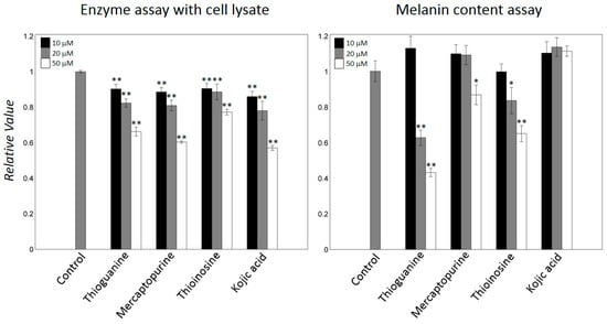 To determine whether the thiopurine-drugs inhibit mammalian tyrosinase, we performed an enzymatic assay with melanoma B16F10 cell lysates. The addition of thioguanine, mercaptopurine, and thioinosine to the lysates inhibited melanin syntheses in a concentration-dependent manner. Mercaptopurine exhibited the highest inhibition, showing a comparable decrement to that induced by kojic acid (Figure 5). The cytotoxicity and the cellular activity of thioguanine, mercaptopurine, and thioinosine were assessed using the 3-(4,5-dimethylthiazol-2-yl)-2,5-diphenyltetrazolium bromide (MTT) and melanin content assays, respectively, in B16F10 cells. Previous results showed that thioguanine and mercaptopurine are less cytotoxic up to several tens of μM in human hepatocytes [43]. Although we cannot exclude other potential cellular damages, the addition of up to 50 μM of any of the three inhibitors did not notably decrease the reduction in the MTT reaction. Thioguanine and thioinosine markedly reduced the melanin content at 20 and 50 μM, whereas mercaptopurine was less effective (Figure 5). In particular, the quantification of the decrease that was caused by 50 μM thioguanine showed that it was approximately 57%. Meanwhile, different from the enzyme inhibition with cell lysate, the decrement of melanin contents by kojic acid was marginal under the tested conditions. It is consistent with the data that reported the meaningful decreases by kojic acid at higher concentrations (>100 μM) [44,45,46]. There was no obvious correlation in the results by enzyme- and cell-based assays. Several possibilities may explain the inconsistencies. First, the structural difference between mushroom and mammalian tyrosinases can result in the varied inhibitions. The sequence identity between two tyrosinases is smaller than 25% although the residues comprising the catalytic core are evolutionarily conserved (Figure S2). Second, the existences of the bindings to off-targets can cause the differences in the active concentrations. Third, pharmaceutical features, such as cell penetration and solubility under cellular environments, may differ in the three inhibitors.