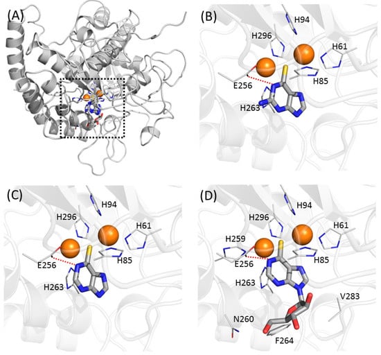 Predicted binding modes of thiopurine inhibitors in this study. (A) Overlaid poses against mushroom tyrosinase. Two copper atoms in tyrosinase are indicated as orange spheres. Predicted binding modes in (B) thioguanine, (C) mercaptopurine, and (D) thioinosine are represented. Residues involved in intermolecular contacts from tyrosinase are labelled. Lines indicate intermolecular hydrophilic interaction. Figures were prepared and arranged to have identical direction using Pymol [47].