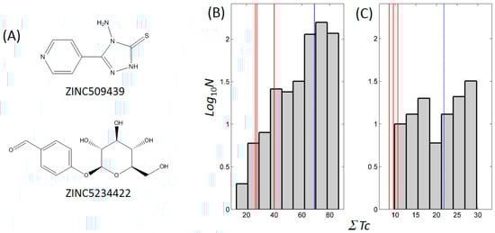 Quantification of chemical similarity to known tyrosinase inhibitors. (A) Of the 418 BindingDB-deposited known inhibitors [48], the most similar ones to the inhibitors in this study are presented. ZINC509439 showed the closest chemical structure to thioguanine and mercaptopurine with Tanimoto coefficients (Tc) of 0.15 and 0.18, respectively, whereas the closest inhibitor to thioinosine was ZINC509439 with a Tc of 0.27. Histograms of distributions of ∑Tc values of (B) all and (C) 115 thione-containing tyrosinase inhibitors are presented. ∑Tc is defined as the sum of Tcs between a test molecule and a set of inhibitors. N in y-axes means the frequency. ∑Tc values of thioguanine, mercaptopurine, and thioinosine were (B) 27.62, 26.45, and 39.95 and (C) 9.58, 8.56, and 10.68, respectively. Corresponding positions are shown as red lines. Mean ∑Tc values in all and 115 thione-containing tyrosinase inhibitors were 69.00 and 21.81, respectively, and are denoted as dashed blue lines.