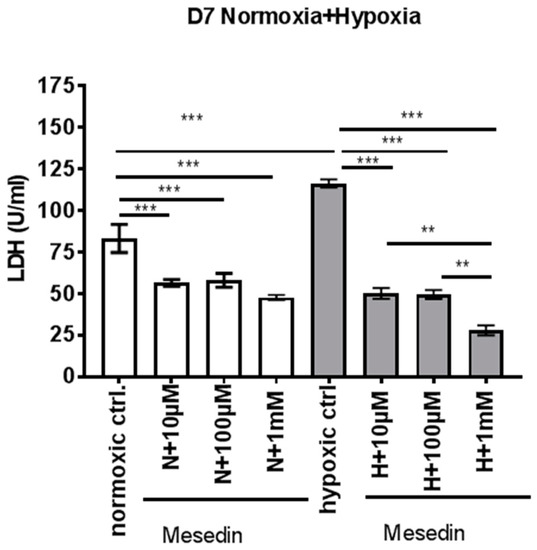 Upon both normoxia and hypoxia, LDH decrease was achieved by all three concentrations used, where the highest concentration (1 mM) was the most effective in the hypoxic condition (Figure 2). In our further experiments, we used the lowest concentration of mesedin (10 µM), which turned to be efficacious in decreasing LDH release under both normoxic and hypoxic conditions in APC.