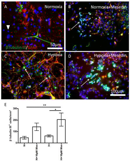 In the normoxic control, the APC contained mainly the population of GFAP+ astrocytes and neurons positive for β-tubulin III (Figure 3A). The population of GFAP and β-tubulin III-negative (presumably precursor) cells in normoxic control was detectable only with 4′,6-diamidine-2′-phenylindole dihydrochloride (DAPI) nuclear staining (Figure 3A arrowhead). This population nearly disappears in mesedin treated APC upon normoxia and hypoxia (Figure 3B,D). Since other cell types in APC (microglia, endothelial cells, and mature oligodendrocytes) cannot give rise to neurons, the population of cells negative for β-tubulin III and GFAP is most likely to be attributed to the population of precursor cells that switch to β-tubulin III (arrows in Figure 3B,D), and/or GFAP-positive phenotype upon mesedin treatment. Hypoxia increased the population of differentiated GFAP+ astrocytes, while the content of β-tubulin III-positive cells was restricted to a very few immature (judging from their shape) neuronal precursors (arrows in Figure 3C). Mesedin treatment of hypoxic cultures led to a remarkable increase of this β-tubulin III-positive population (arrow in Figure 3D). Quantification of β-tubulin III-positive cells displayed a significant increase in population of neuronal precursors/young neurons treated with mesedin upon both normoxic and hypoxic culture conditions (Figure 3E).