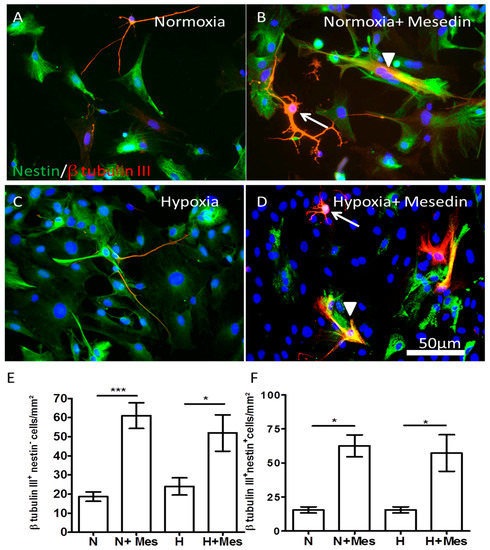 We further addressed the question whether mesedin can also enhance the population of neural precursor cells and influence their commitment to the neuronal lineage in advanced stages of astroglial differentiation. Therefore, we used APC at DIV14, and assessed the number of β-tubulin III/nestin-positive cells upon normoxic and hypoxic culture conditions. Indeed under both normoxia and hypoxia, in comparison with the respective control condition (Figure 4A,C), mesedin-treated culture contained a higher number of neuronal progenitors (arrowheads in Figure 4B,D) and neurons (arrows in Figure 4B,D), as shown by immunocytochemistry.