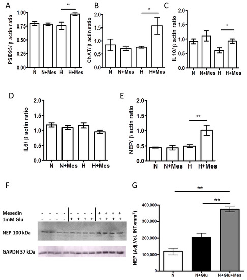 As a consequence of our findings on mesedin’s neuroprotective and neuroregenerative effects, as well as its capacity to influence the neuroinflammation and the Aβ-degrading enzyme in normal APC (upon hypoxic and normoxic culture conditions), we further tested whether these features are relevant to cultures exerting Alzheimer’s-like pathology. Therefore, APC from 3×Tg-AD mice were isolated and cultured in normoxic conditions. To generate the in vitro AD-like condition that comes closer to the in vivo AD-like pathology, the addition of glutamate (Glu) was considered to mimic the high extracellular content of Glu in the brain affected by AD [33]. As a first step, we assessed the expression of neprilysin upon exposure to Glu and mesedin by Western blot and densitometric analyses (Figure 5F,G). Exposure of Glu displayed a tendency to increase neprilysin in comparison with the control without Glu, while the administration of mesedin upon Glu exposure significantly increased neprilysin when compared to controls with and without Glu (Figure 5F,G).