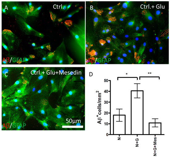 Whether the mesedin-induced increase in neprilysin will lead to changes in intracellular Aβ accumulation was tested by immunocytochemical analyses of Aβ content in the 3×Tg-AD APC cultures with and without Glu exposure (Figure 6). Glu exposure to the 3×Tg-AD APC led to a higher positivity of Aβ in GFAP+ astroglia (cf. Figure 6A,B). A significant decrease in intracellular Aβ content was seen upon administration of mesedin in comparison with controls exposed to Glu, as it was shown by immunocytochemistry (cf. Figure 6B,C) and the quantification of Aβ-positive cells (Figure 6D).