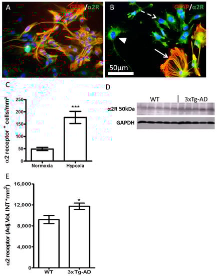 Increased expression of α2 receptor upon hypoxia and AD-like culture condition. (A) APC (DIV7) from the brains of new born C57BL/6 stained for GFAP (red) and α2 receptor (green); (B) Increased α2 receptor (green) in GFAP+ (red) astroglia (arrow), neurons (arrowhead), and fibroblast-like progenitors (dashed arrow) upon hypoxia; (C) Quantification of α2 receptor-positive cells in DIV7 APC from the brains of C57BL/6 newborn mice. (D) Western blot analysis of α2 receptor (α2R) from the brain homogenates of 14-month-old 3×Tg-AD and wild type (WT) C57/BL6 mice. (E) Densitometric analysis of (D). Data are presented as mean ± SEM (n = 5) and analyzed by Student’s t-test. * p < 0.05; *** p < 0.001. Scale bar in (B) is 50 µm.