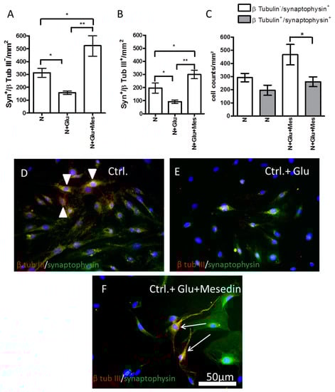Keeping in mind the effect of mesedin on the synaptic marker and the protection of neuronal population against hypoxia in the wild type APC (Figure 3 and Figure 4), we tested the influence of mesedin on the survival of β-tubulin III+/synaptophysin+ neurons and β-tubulin III−/synaptophysin+ astroglia in 3×Tg-AD APC upon exposure of Glu (Figure 8). Both astroglia and neurons responded to mesedin (upon Glu exposure) with increased synaptophysin reactivity in comparison to the controls with or without Glu (N and N + Glu vs. N + Glu + Mes in Figure 8A,B). Within both cell types (β-tubulin III-positive and -negative cells) the population of synaptophysin-positive cells under normoxic control conditions was nearly equally small (Figure 8C). In contrast, in mesedin-treated cultures, the population of synaptophysin-positive (presumably) astrocytes was larger than synaptophysin-positive neurons (Figure 8C). Interestingly, mesedin was capable of not only increasing the population synaptophysin-positive cells, but also protecting neurons (arrows in Figure 8F) against Aβ- and Glu toxicity in the 3×Tg-AD APC, when compared with the control exposed to Glu that nearly lacked neuronal population (Figure 8E,F). Mesedin appeared also to promote the differentiation of neurons reflected by morphological changes in β-tubulin III+ population between the control without Glu and mesedin + Glu treated APC. The majority of β-tubulin III+ cells in the control displayed a round or spindle-like shape (Figure 8D arrowheads), while in the mesedin treated group, the β-tubulin III+ population exerted a more mature neuronal morphology (Figure 8F, arrows).