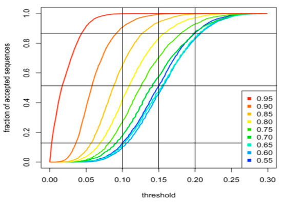 Choice of bb ∆Do value for each rejection threshold. The fraction of accepted bb sequences (y-axis) is reported as a function of the threshold value for each Dt (x-axis). Vertical lines locate 0.1, 0.15 and 0.2 thresholds on the curves. The three horizontal lines cross each vertical line on one of the three Dt curves with the lowest Dt values (i.e., 0.55, 0.60, 0.65). Bbs were generated as described in Figure 1. Inset, color code of Dt values.