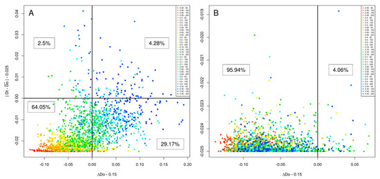 Comparison between two alternative methods for generating the starting IDP sequence. For each generated sequence, ∆Do and |Dt − | were computed and subtracted from their corresponding threshold (0.15 and 0.025, respectively, as indicated on the x- and y-axes). Sequences are accepted by InSiDDe only if (∆Do − 0.15) and (|Dt − | − 0.025) are both negative. (A) The first sequence (step (1) in Figure 4) was generated by appending randomly chosen bbs from one family of the bb library; (B) The first sequence (step (1) in Figure 4) was generated by repeating a randomly chosen bb from one family of the bb library. The percentage of sequences is indicated for each combination of positive or negative (∆Do − 0.15) and (|Dt − | − 0.025) values. The color code of each combination of Dt values (ranging 0.55 to 0.95) and sequence lengths (50, 100, 150 and 200 residues) is indicated in the box on the right of each graph.