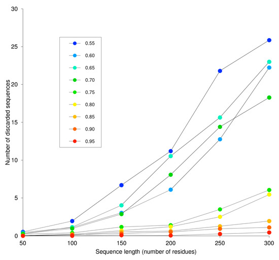 The length of artificial sequences generated by InSiDDe ranges from 50 to 200 residues. The lower limit is dictated by IUPred specificities and the upper limit by the connection time out per sequence that has been set to 5 min. To assess the largest sequence length that can be generated before this time threshold is reached, we calculated the number of discarded sequences, as a function of sequence length, for different Dt values. As expected, Figure 7 clearly shows an increase in the number of discarded sequences with increasing lr and, hence, in the time required to generate a sequence. However, Figure 7 also shows an unexpected increase in the number of discarded sequences when Dt decreases, as already seen in the experiments reported in Figure 2 and Figure 5. We have no explanation for this observation since the sequences are generated starting from the same number of bbs (i.e., 50) whatever their Dt. According to Figure 7, if sequences exceeding 200 amino acids can be quickly obtained by InSiDDe provided that they have a high IUPred disorder score (i.e., Dt > 0.75), generating lengthy sequences with low Dt values is more prone to failure. For that reason, the longest sequence computed by InSiDDe has been set to 200 residues.