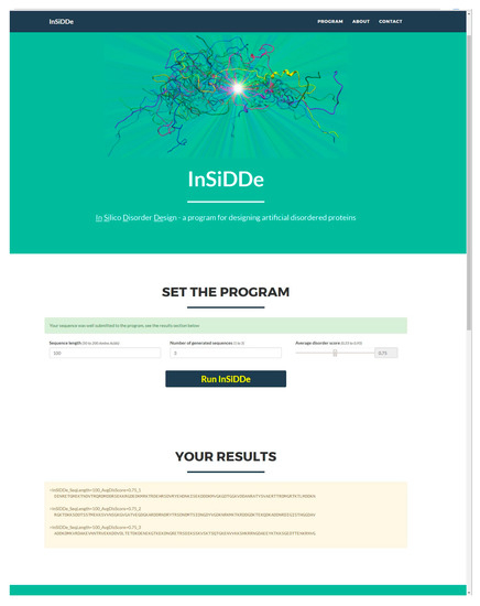 InSiDDe is publicly available at http://insidde.afmb.univ-mrs.fr/. Figure 8 shows a screen-capture of the web interface. Under the display banner “SET THE PROGRAM”, the user is prompted to (i) enter the length of the desired sequence (minimum (50) and maximum (200) numbers of residues are specified above the window); (ii) enter the number of desired sequences (minimum (1) and maximum (10) values are specified above the window); (iii) select the target average disorder probability among values ranging from 0.55 to 0.95 with 0.05 intervals within preselected values. After clicking “Run InSiDDe”, results appear below the display banner “YOUR RESULTS” in the form of amino acid sequence(s) in FASTA format. The name of each generated sequence reflects the length of the sequence, its average IUPred disorder score, and the ranking of the sequence in that series. At the bottom of the page (not visible in Figure 8), a link to IUPred provides a way to visualize and ∆Do. The number of simultaneous queries has been limited to 10 to preserve the physical resources of the server. For the same reason, if an identical request is sent within 10 min, the same result will be returned without recomputing. Examples of IDP sequences generated by InSiDDe are provided in the Supplementary Figure S1.