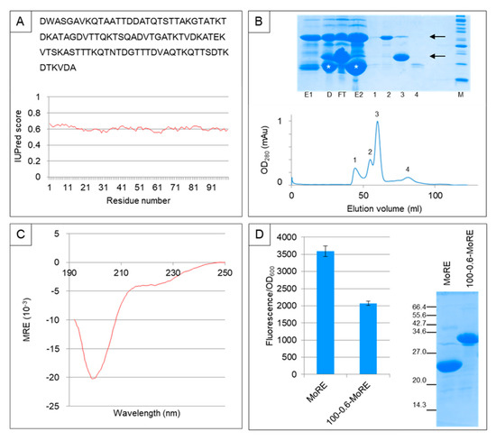 We tested the ability of 100-0.6-MoRE to be recombinantly expressed in, and purified from, E. coli as a thioredoxin-6His fusion protein. As can be seen in the upper panel of Figure 9B, the thioredoxin-6His-100-0.6-MoRE fusion was well expressed in the soluble fraction of the bacterial lysate and could be purified by immobilized metal affinity chromatography (IMAC). The thioredoxin-6His tag was efficiently removed by TEV protease digestion, yielding a pure non-degraded 100-0.6-MoRE protein of the expected molecular mass. Thus, InSiDDe is able to generate an artificial IDP sequence that can be efficiently expressed in E. coli and purified to yield a homogenous product. The availability of pure 100-0.6-MoRE allowed us to investigate its hydrodynamic properties by size exclusion chromatography (SEC) (Figure 9B, lower panel). The experimentally determined Stokes radius (RSobs = 26.7 ± 2 Å) was larger than expected for a natively folded protein (RSNF = 18.2 Å) [19] and much closer to the value expected for an IDP (RSIDP = 28.8 Å) [20]. Finally, 100-0.6-MoRE exhibits a far-UV circular dichroism spectrum typical of an IDP with a pronounced negative peak at 200 nm and a low ellipticity between 190 and 195 nm (Figure 9C).