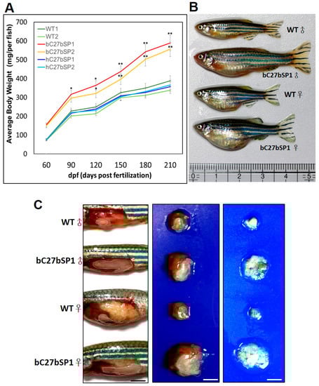2.2. Generation of Transgenic C27bSPs (bC27bSP1, 2 and hC27bSP1, 2) Zebrafish Lines