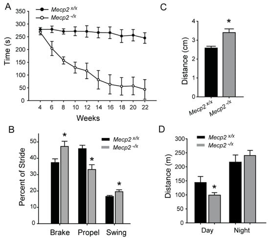 - Vogel Ciernia, A.; Pride, M.C.; Durbin-Johnson, B.; Noronha, A.; Chang, A.; Yasui, D.H.; Crawley, J.N.; LaSalle, J.M. Early motor phenotype detection in a female mouse model of Rett syndrome is improved by cross-fostering. Hum. Mol. Genet. 2017, 26, 1839–1854. [Google Scholar] [CrossRef] [PubMed]