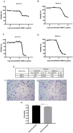 CMS-2, but not CMS-1, treatment reduces cell viability of murine melanoma and melanocyte. Cell viability was evaluated by Resazurin metabolism after 24 h of CMS-1 or CMS-2 exposure (0.5–100 µg/mL) in: B16-F10 (A,C), respectively; or Melan-a (B,D), respectively. Absorbance of Resazurin metabolite was spectrophotometrically quantified (570/600 nm) and half maximal inhibitory concentration (IC50) was determined through non-linear regression of Log concentration versus absorbance (E). (F,G) Representative images of B16-F10 treated with 10 µg/mL CMS-2 after 24 h. CMS-2 treated cells (G) are more circular, quantified in (H), fusiform and dendritic compared to the control (F). (H) Cell circularity was quantified in B16-F10 cells treated with CMS-2 using ImageJ software. **** p < 0.001, t-test, compared to B16-F10 control.