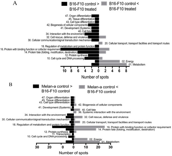 The identified proteins were classified according to FunCat (Functional Catalogue of Proteins) and categorized into 19 diverse functional groups. Figure 3A shows that most protein categories were upregulated (48 proteins) in B16-F10 control compared to CMS-2 treated B16-F10 cells. The exceptions were proteins functionally related to metabolism, energy, cellular transport, transport facilities and transport routes, in which case, a decrease of these proteins was observed following treatment. A comparison of B16-F10 control and Melan-a control showed that most protein categories are more abundant in Melan-a control (Figure 3B). However, proteins involved in metabolism, energy, protein fate (folding, modification, and destination), proteins with a binding role or cofactor requirement (structural or catalytic), cellular transport, transport facilities and routes, cell rescue, defense and virulence, and cell fate had their expression increased in B16-F10 control. Most upregulated proteins in B16-F10 treated with CMS-2 compared to Melan-a control belong to categories of metabolism, energy, transcription, protein fate (folding, modification, and destination), binding function or cofactor requirement (structural or catalytic), cellular transport, transport facilities, transport routes, cellular communication/signal transduction mechanism, systemic interaction with the environment and cell fate (Figure 3C).