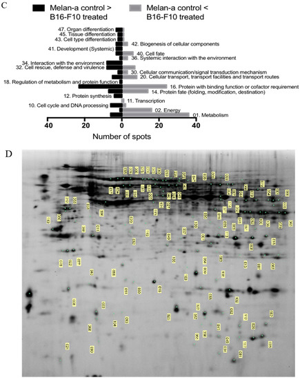 Proteomic analysis of B16-F10 and Melan-a cells treated with CMS-2 including functional assignment of identified proteins: (A) comparison between B16-F10 control and treated; (B) comparison of Melan-a control to B16-F10 control; and (C) comparison between Melan-a control and B16-F10 treated. Exactly 10 µg/mL was added to treated cells. Protein functional classification was based on FunCat (http://mips.helmholtz-muenchen.de/genre/proj/mfungd/index.html) database. (D) Image of two-dimensional Difference Gel Electrophoresis (DIGE) (SDS-PAGE 12%, strips IPG 24 cm, pH 3−11 nonlinear) representing an overlay of six gels used to analyzed the protein extracts from B16-F10 control, B16-F10 treated, Melan-a control and Melan-a treated. The spots labeled in this composite image includes all the selected spots for the analysis.