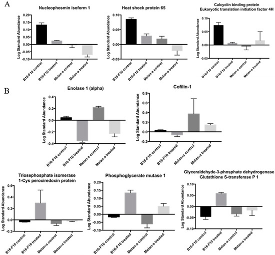 Groups of proteins whose expressions were statistically altered by CMS-2 treatment: (A) Group 1 includes proteins whose expression was initially increased in B16-F10 (control) but after CMS-2 treatment normalized their expression (became similar to Melan-a control); and (B) Group 2 includes proteins which after CMS-2 treatment altered the expression in both cell lines (similar expression in Melan-a control and B16-F10 control but different expression compared to B16-F10 treated).