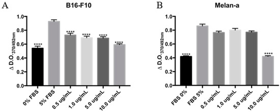 CMS-2 inhibits proliferation of melanoma and melanocyte cell line. Cell proliferation was evaluated by incorporation of bromodeoxyuridine (BrDU) assay after 24 h of CMS-2 treatment (0.5–10 μg/mL). DNA synthesis, represented by the difference in absorbance between 370 and 492 nm for: B16-F10 (A); and Melan-a (B). **** p < 0.001, analysis of variance, Bonferroni post-test compared to 5% fetal bovine serum (FBS) positive control. The negative control was 0% FBS.