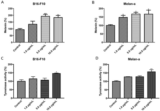 The effect of CMS-2 on melanogenesis was evaluated by quantification of melanin content and tyrosinase activity (Figure 6). CMS-2 treatment significantly increased the amount of melanin in both cell lines. In B16-F10 at 5 and 10 μg/mL CMS-2, melanin increased by 93% and 84%, respectively, compared to the control (Figure 6A), whereas, in Melan-a, the melanin content increased by 67% at 5 and 10 μg/mL CMS-2 (Figure 6B). Interestingly, tyrosinase, the enzyme responsible for melanin synthesis, showed increased activity in B16-F10 (Figure 6C) and Melan-a (Figure 6D) only at 10 μg/mL CMS-2.
