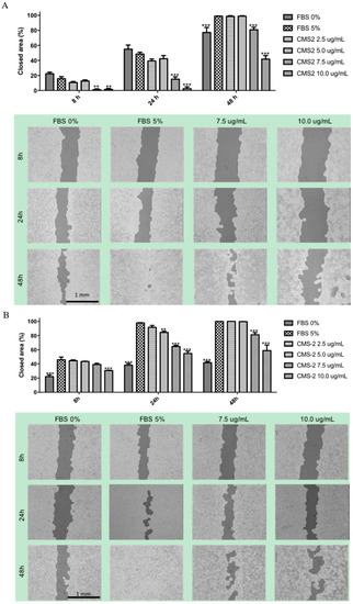 The inhibitory effect of CMS-2 on cellular migration was evaluated by the scratch assay [68]. Briefly, exponentially growing cells, plated onto 24-well plates, were allowed to form a confluent monolayer. The cell monolayer was linearly scraped with a p-200 pipet tip. The debris were removed by washing the plate with 1 mL of growth medium. The medium was replaced with 500 μL of CMS-2 (2.5–10 μg/mL), diluted in culture medium supplemented with 5% of FBS. Images of the closure of the scratch were captured at 0, 8, 24 and 48 h after the treatment. The images were quantitatively analyzed using TScratch software (CSE Lab, Zurich, Switzerland). The results are shown as the percent closing area, considering 0% at 0-time interval.