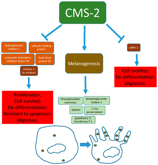 In addition, CMS-2 promoted downregulation of cofilin-1 and α-enolase in B16-F10 cells compared to B16-F10 or Melan-a controls (Figure 4B). Considering the key function of cofilin-1 during actin polymerization and cell motility [55,56,57], the reduction of this protein explains the inhibitory effect of CMS-2 in cell migration (Figure 7). Cofilin-1 is a small ubiquitous protein (≈19 kDa) that enhances actin action by binding and severing actin filaments during cell migration [57]. Additionally, downregulation of cofilin-1, and consequently stabilization of actin filaments, can explain the morphological changes in B16-F10 observed after 24 h of CMS-2 exposure (Figure 2F–H). The untreated melanocyte and melanoma cells were rounded with epithelial-like shape, while CMS-2 treated cells were less circular and display dendritic-like outgrowths, a characteristic differentiation marker for melanocytes [58]. In the case of α-enolase, also a glycolytic enzyme, its down regulation is seen as a method to reduce the number of lung metastases in immunosuppressed mice injected with pancreatic ductal adenocarcinoma cells (PDAC) a highly aggressive malignancy characterized by rapid progression, invasiveness and resistance to treatment [59].