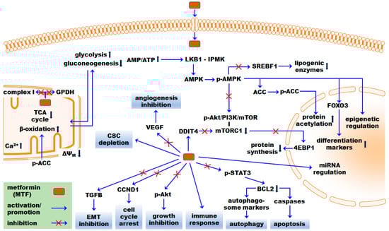 MTF exerts its primary main effects at the molecular level as an oxidative phosphorylation (OXPHOS) inhibitor by reversibly inhibiting NADH dehydrogenase (mitochondrial complex I) activity of the respiratory chain, resulting in suppression of ATP production [,,]. The AMP-activated protein kinase (AMPK) is a key molecule by which MTF exerts a substantial part of its pleiotropic effects []. The whole spectrum of MTF anticancer effects on the molecular and cellular levels is subject of several in vitro and in vivo studies. Observational studies, clinical trials, and meta-analyses are undertaken to assess beneficial effects of MTF on cancer treatment. This review aims to provide a comprehensive overview of the current knowledge of MTF applications in cancer research with an emphasis on the underlying molecular biology effects of MTF.
