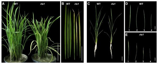 The phenotype of WT (wild type) and rls1 plants. (A) Soil-grown seedlings at the five-leaf stage; (B) the appearance of fully expanded seedling leaves; (C) hydroponics-grown 35 day old plants at the tillering stage; (D,E) the appearance of the first, second, third and fourth fully expanded leaf (counting from the apex to the base of the main tiller) of 35 day old (D) WT and (E) rls1 mutant plants. Bars in (A,C): 10 cm, in (B,D,E): 5 cm.
