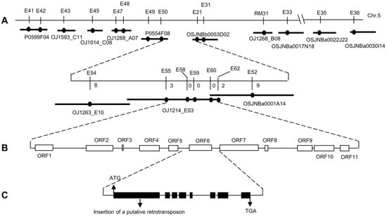The genomic region harboring the target gene, as defined by fine mapping, contained several putative genes; each of these was targeted by a PCR assay, which was conducted on genomic DNA extracted from plants expressing the mutant phenotype. The resulting amplicons were gel-purified and submitted to the Shanghai Sunny Biotechnology Co. Ltd. (Shanghai, China) for sequencing. The plants used for this purpose included the original mutant line and an F2 segregant from the mapping cross. TAIL-PCR was used to isolate genomic sequences flanking the insertions in the transgenic plants []. The genomic sequence flanking the Tos17 insertion on the left side was amplified using the primers ls4F, ls41F and ls42F, and that on the right-side primers ls4R, ls421R and ls422R (Table S1). The degenerate primers required were those described by Zhu et al. []. The resulting amplicons were sequenced by the Shanghai Sunny Biotechnology Co. Ltd. (www.sunny-biotech.com, Shanghai, China). The sequences of the primers used for sequencing are listed in Table S1.